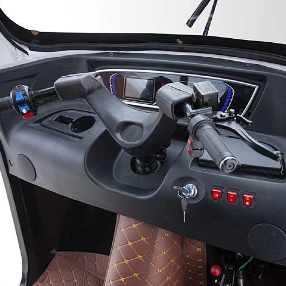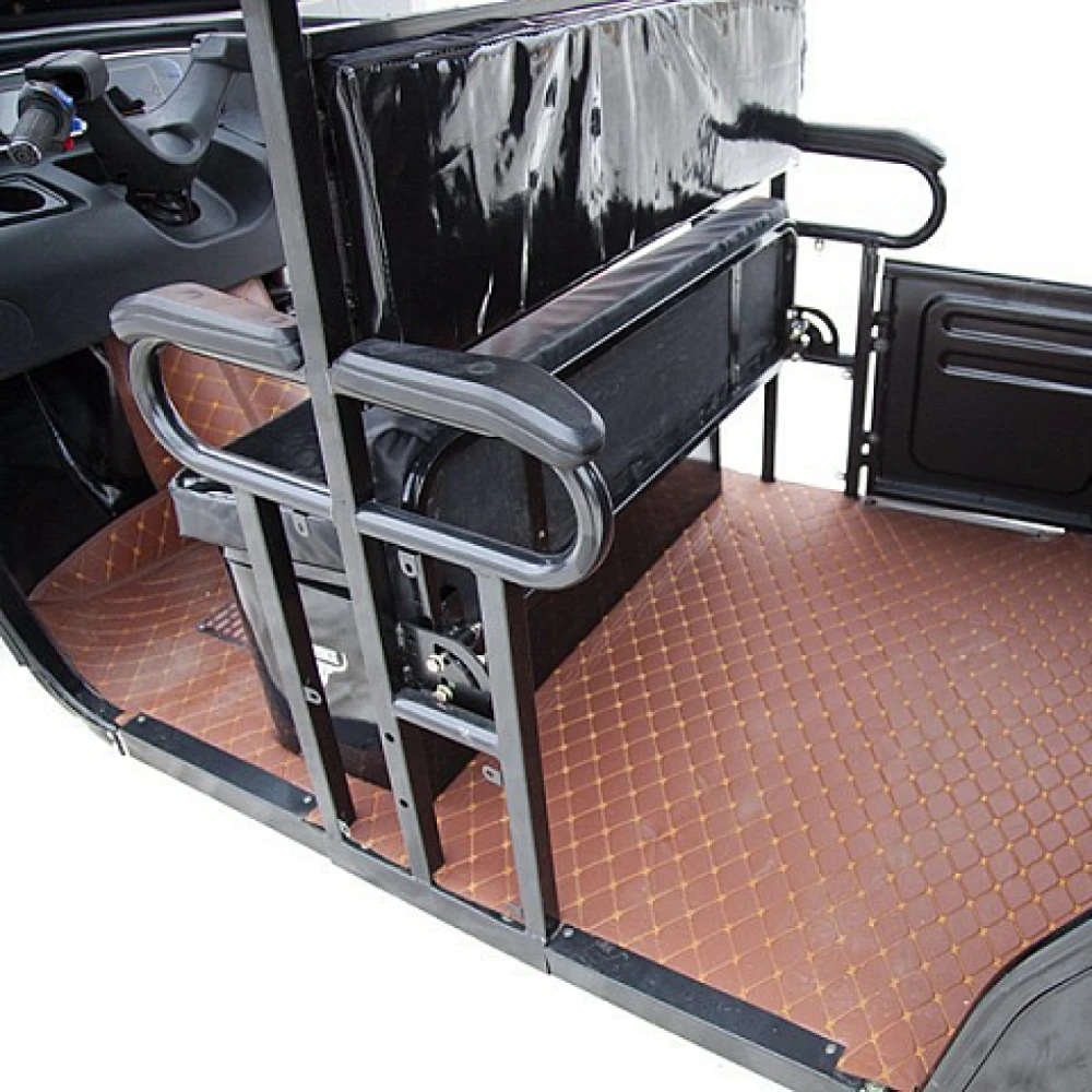 Удобство и комфорт езды обеспечены 2 мягкими анатомическими сиденьями. Наличие крыши позволяет спрятаться от негативного воздействия ультрафиолета и осадков. 12 дюймовые нактистые колеса способны преодолевать подъемы до 15 градусов, обеспечивать плавность езды по неровностям. Скорости контролируются с помощью ручки газа. Важные технические параметры с помощью бортового компьютера, размещенного на видимой части панели.
