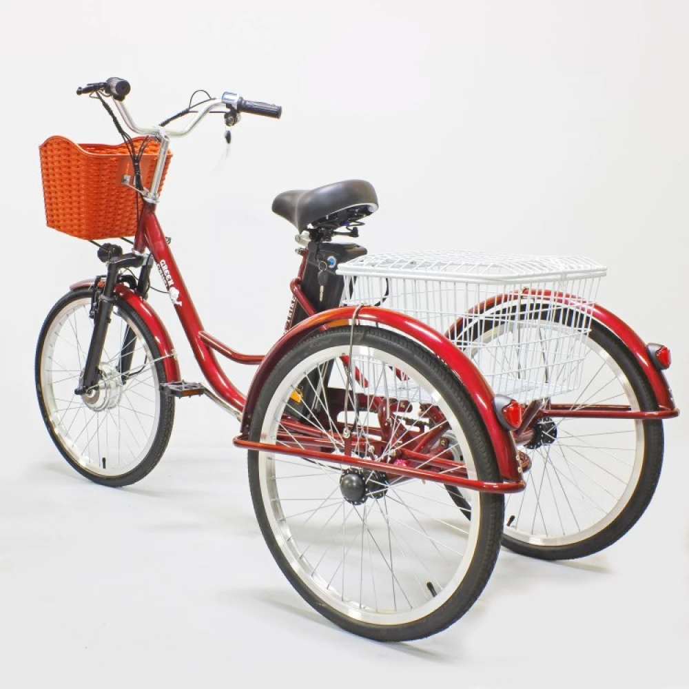 Электровелосипед представлен компактными эргономичными характеристиками, предназначен для ежедневных прогулок и грузоперевозок. Трехколесная модель оснащена всем необходимым для комфорта и удобства. Оснащена 2 компактными корзинами, первая из которых выглядит модно и привлекательно, а вторая – вместительная. Модель оснащена удобным регулируемым сиденьем, повторяющим анатомические части тела ездока, снимающая нагрузку с позвоночника, не допускающая усталости при длительной езде.
